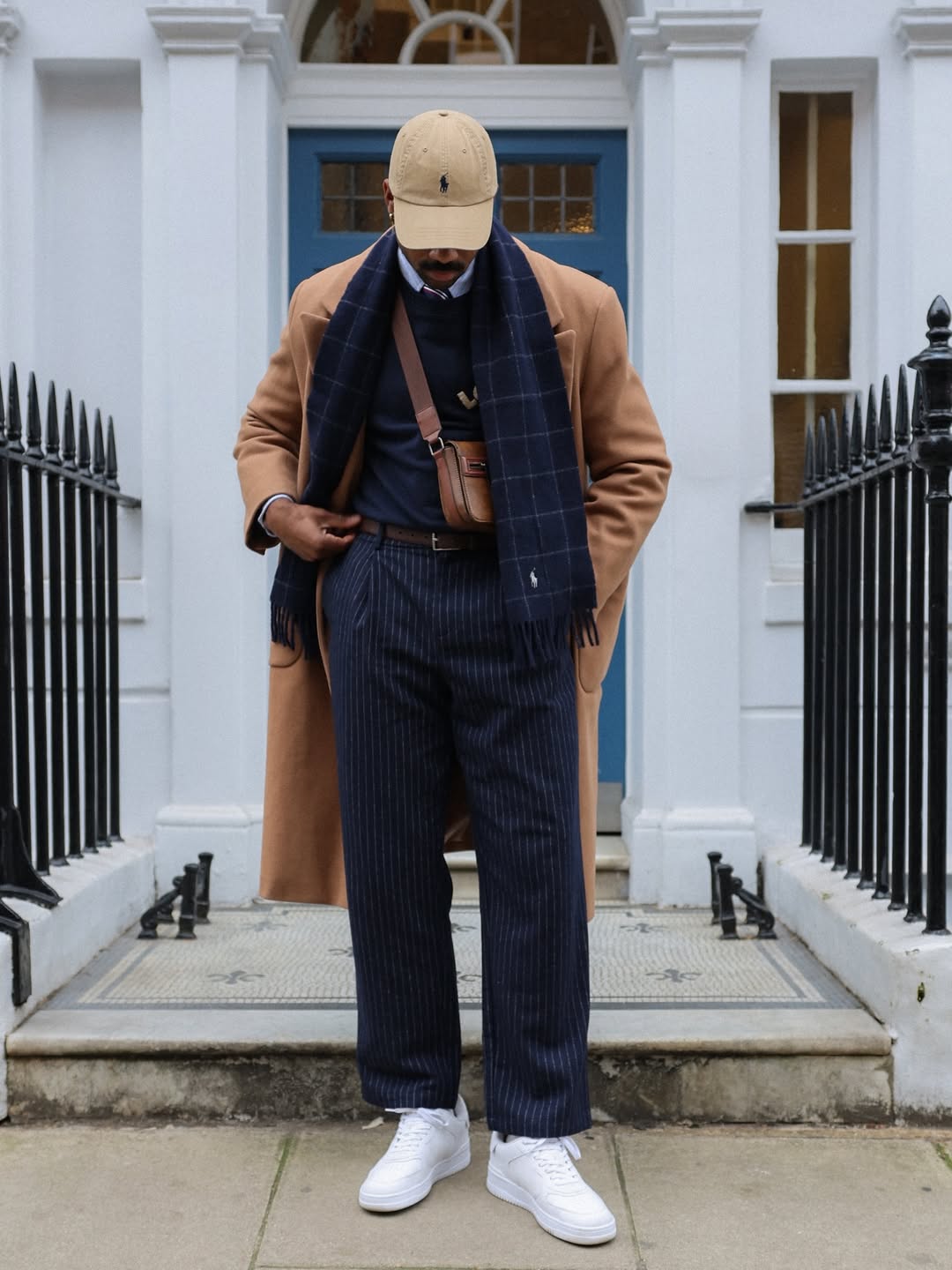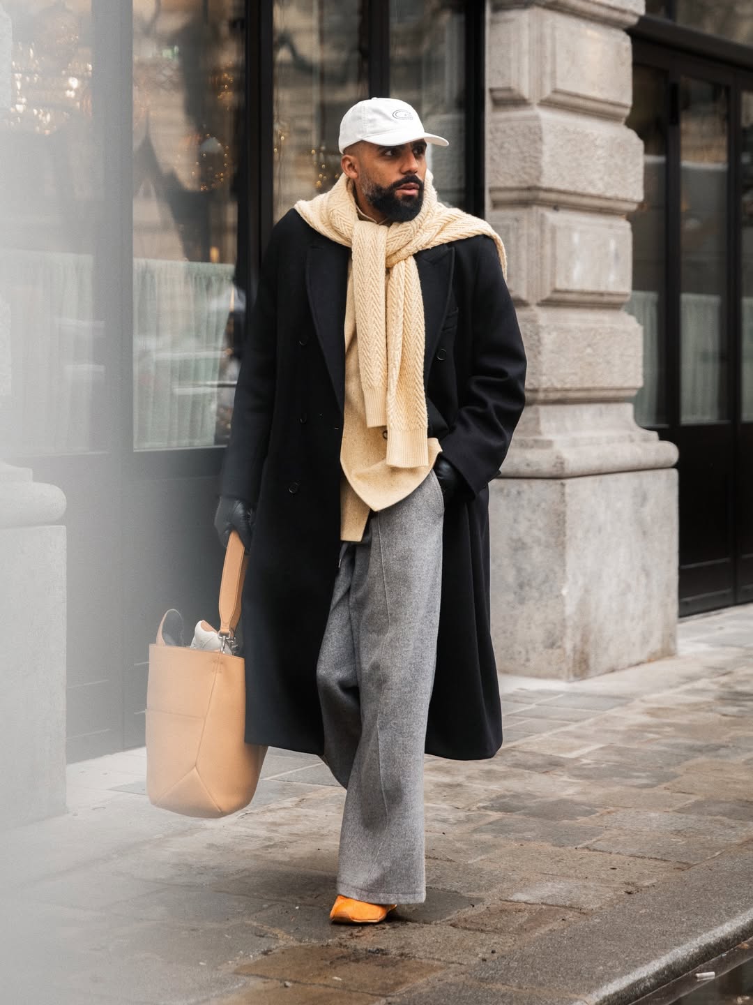 What makes this look work is distinction. A casually wrapped scarf or knit softens the construction, whereas a baseball cap retains issues grounded and fashionable. Clear, intentional sneakers carry all of it collectively. Amongst winter outfit concepts for males, this one proves that enterprise informal doesn’t must imply uncomfortable, and winter doesn’t must really feel inflexible.