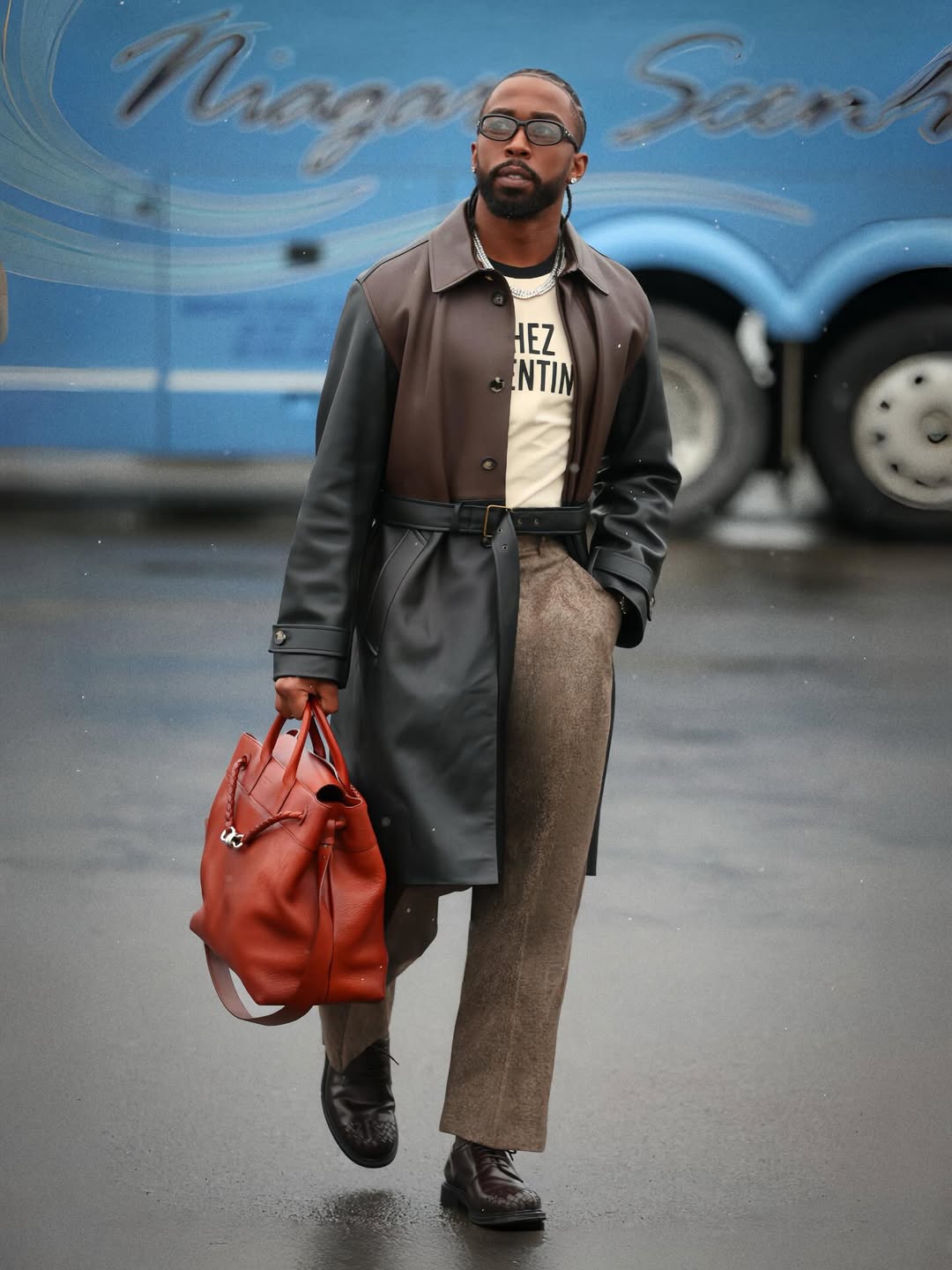 Moreover, add gloves for a completed contact and carry a leather-based weekender bag that means you’re all the time on the transfer. Is it daring? Sure. However that’s exactly why it really works. That is a kind of winter outfit concepts for males that turns practicality into an influence transfer.