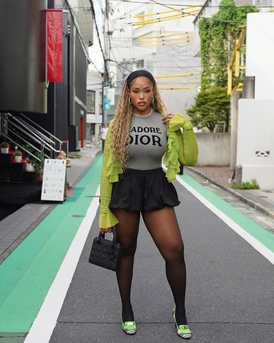 This look proves restraint can nonetheless be enjoyable. A black mini paired with tights creates a impartial base that feels intentional slightly than protected. From there, one rigorously chosen shade threads via the highest and sneakers, repeating simply sufficient to really feel deliberate. The colour doesn’t shout. It hums. It lingers. And most significantly, it lets the outfit really feel completed with out feeling compelled.