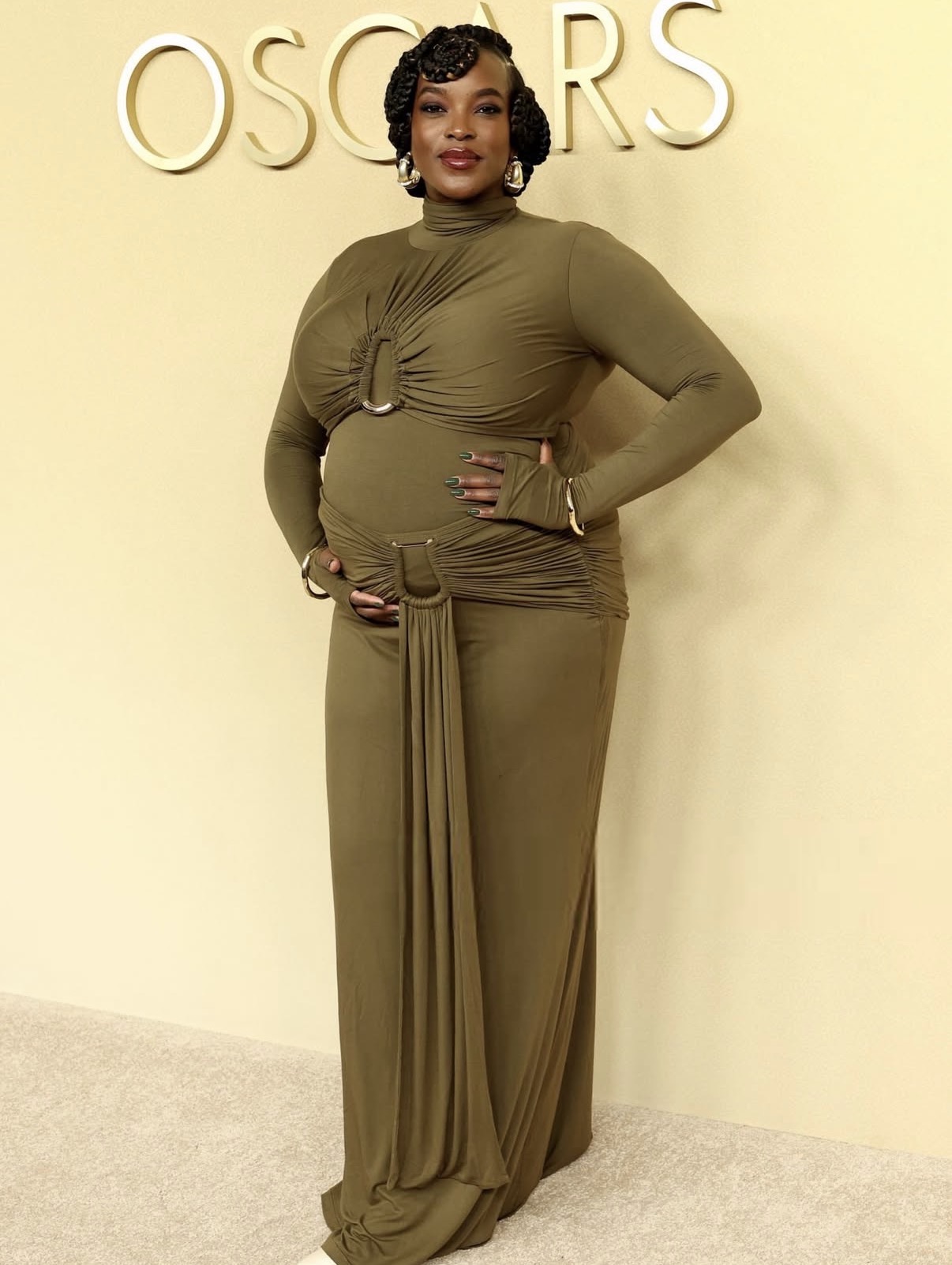 Wunmi Mosaku’s Rī Mī olive inexperienced Mila skirt set created a cohesive, draped silhouette secured with gold {hardware}. The fluid development was architectural but swish, additional elevated by daring gold earrings and stacked bracelets that echoed the metallic detailing.
