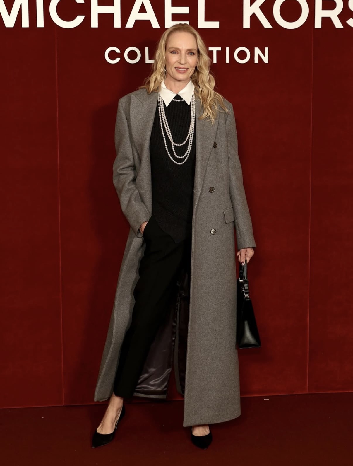 Uma Thurman attended the Michael Kors Fall/Winter 2026 presentation carrying a structured gray wool coat layered over a black ribbed knit and crisp white collar, paired with tailor-made black trousers, traditional pumps, and pearl necklaces. As one of many standout types noticed throughout the New York Style Week F/W exhibits, the ensemble delivered a masterclass in layered magnificence.