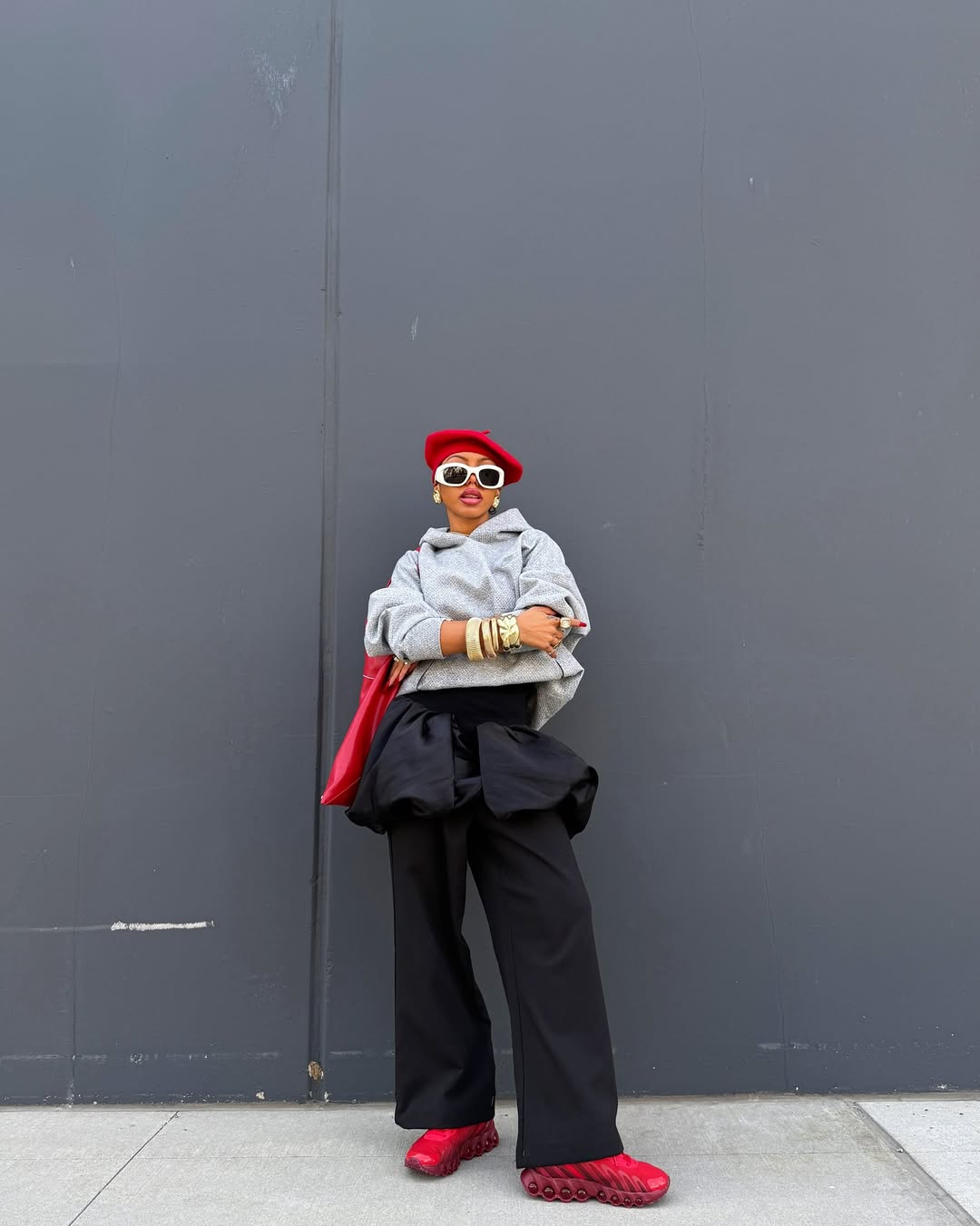 This goes to indicate that consolation can nonetheless have opinions. Free black pants sit straightforward and unapologetically snug. Then a balloon-style skirt layered on high interrupts the calm with quantity and shock. A hooded sweater keeps issues rooted in loungewear territory till the purple equipment take over.