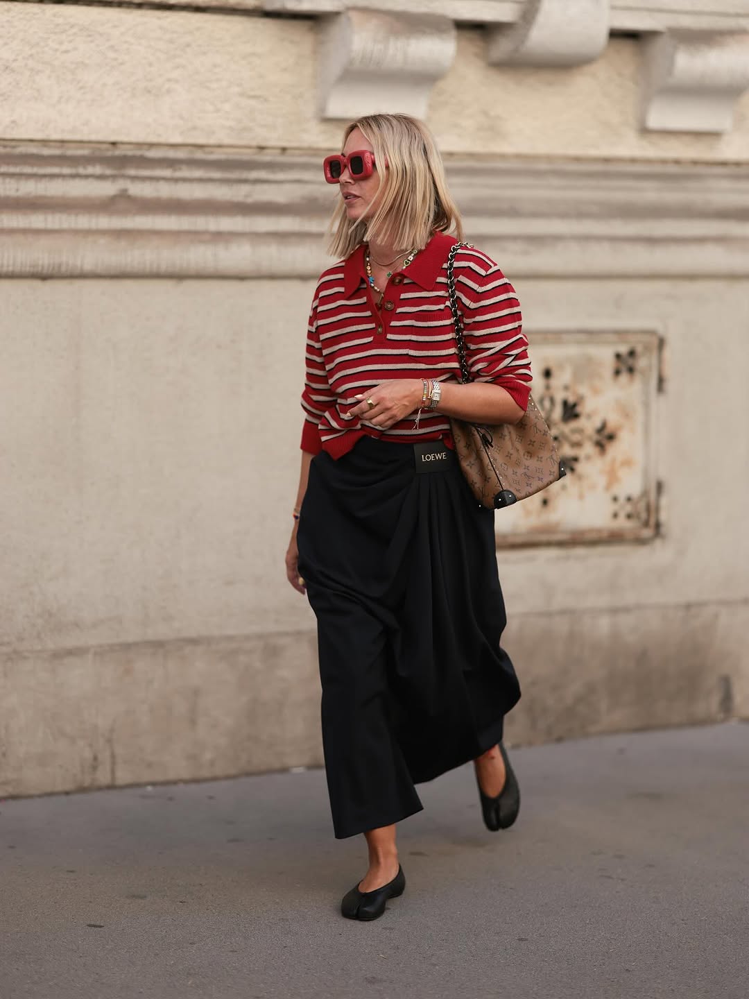 That is how you progress first and clarify later. Draped black pants movement freely, refusing to cling or behave. A colourful striped shirt provides visible tempo, whereas stockings introduce texture. Break up-toe sneakers floor the look with weight and distinction. The combo feels borrowed and barely off-center. Playful with out being messy. Relaxed with out being careless. The form of outfit that will get higher the longer you have a look at it.