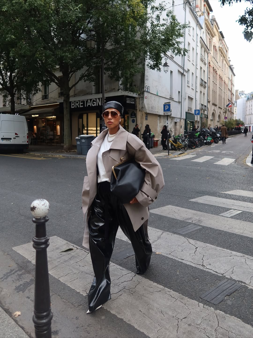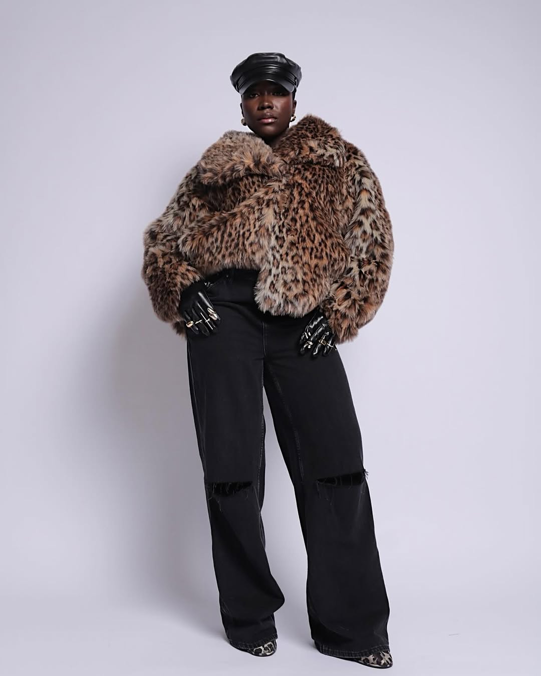 This look doesn’t flirt with chaos. It marries it. Flared black pants set the inspiration, dragging barely as you stroll and creating motion that feels intentional, virtually cinematic. Then animal-print outerwear crashes the scene, refusing to be background noise.