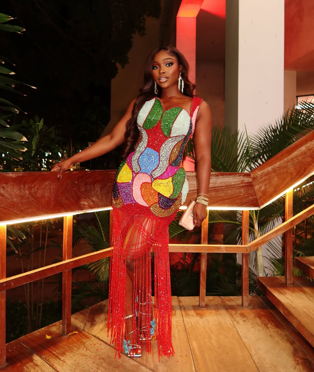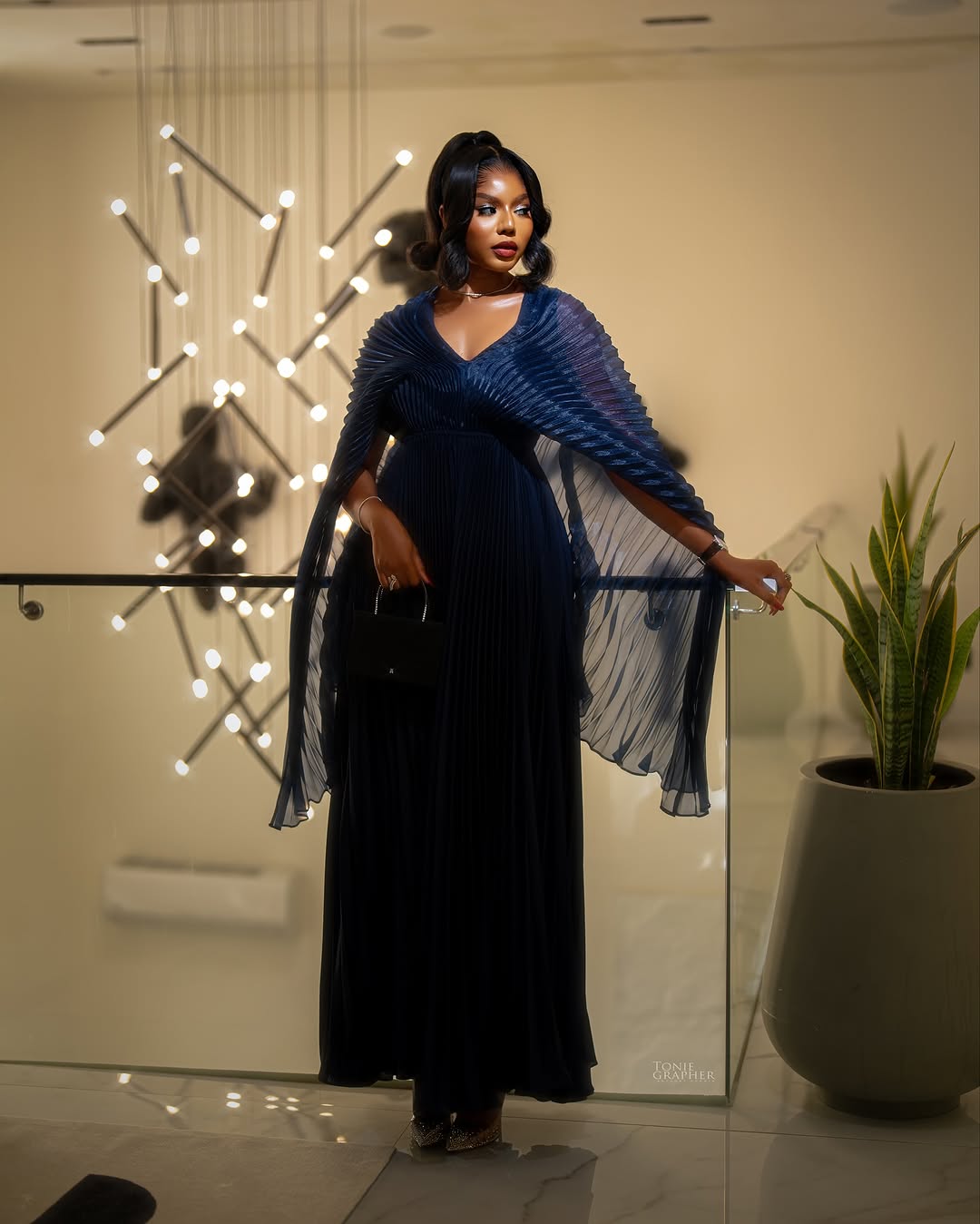 Right here, motion turns into the assertion. A tube silhouette units a clear basis, whereas tiers of pleated cloth construct quantity in a managed, sculptural method. With each step, the pleats ripple, giving the gown vitality and presence.