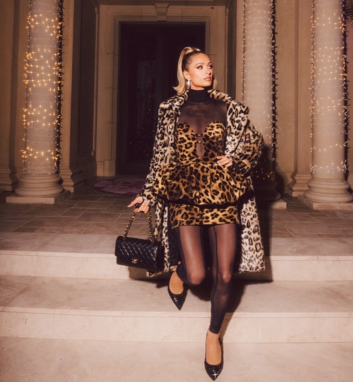Paris Hilton embraced managed glamour in a leopard-print mini gown by The New Arrivals by Ilkyaz Ozel. Crafted in cotton velvet, the gown featured a sweetheart neckline, boned bodice, entrance cut-out, and outlined peplum waist. She layered it with an identical outsized leopard coat, ending with sheer black tights, pointed-toe pumps, and a quilted black purse with a gold chain strap.