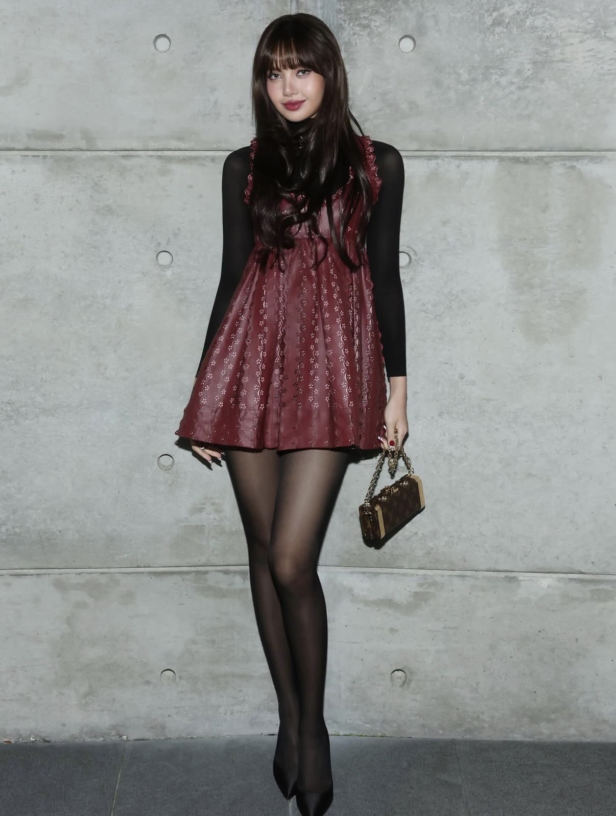 Lisa opted for modern versatility in a deep maroon textured mini gown layered over a fitted black long-sleeved prime. She accomplished the look with sheer black tights, pointed-toe heels, and a compact Louis Vuitton monogram bag, putting a stability between youthful and polished.