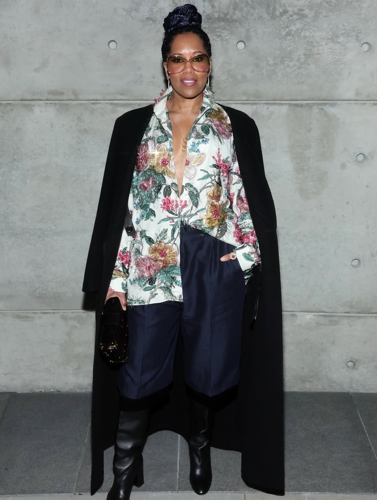 Regina King mastered distinction by way of proportion and layering. An extended black overcoat draped over her shoulders framed a crisp white button-down printed with vibrant multicolored florals. Worn partially unbuttoned right into a deep V, the shirt was paired with wide-legged culotte-style shorts falling just under the knee. Knee-high black boots grounded the look, whereas tinted sun shades and sculptural equipment added perspective.