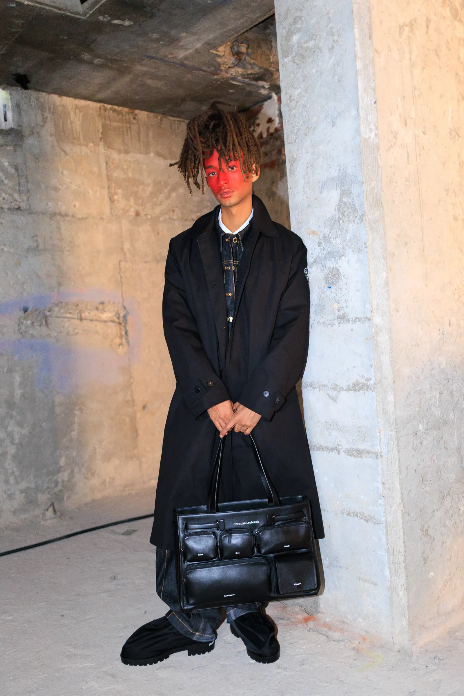 Past footwear, Smith expanded the gathering via equipment that leaned closely into operate and symbolism. Leather bags featured exaggerated exterior pockets labeled with their meant contents, similar to “keys,” “cash,” and “charger,” turning on a regular basis group into a visible assertion.
