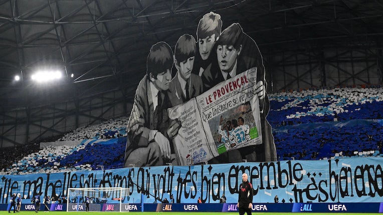 Au programme de la soirée en tribunes, trois hommages. Aux Beatles, d’abord, groupe mythique de Liverpool, représentés en prepare de lire un journal mettant en avant la dernière victoire de l’OM face au membership anglais, en 2004. À IAM, ensuite, avec une référence à la pochette de l’album L’école du micro d’argent et à la punchline du morceau éponyme « J’ai une armée entière sous le charme, prête à mourir, à la gloire de mon étendard ».