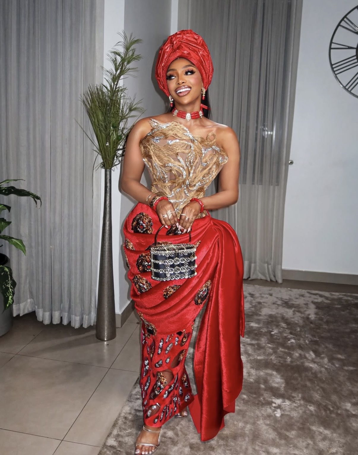 Minimalist strappy heels with delicate sparkle allowed the daring silhouette and saturated hue to command consideration. The look stood as a assured testomony to fashionable Nigerian couture at its most expressive.