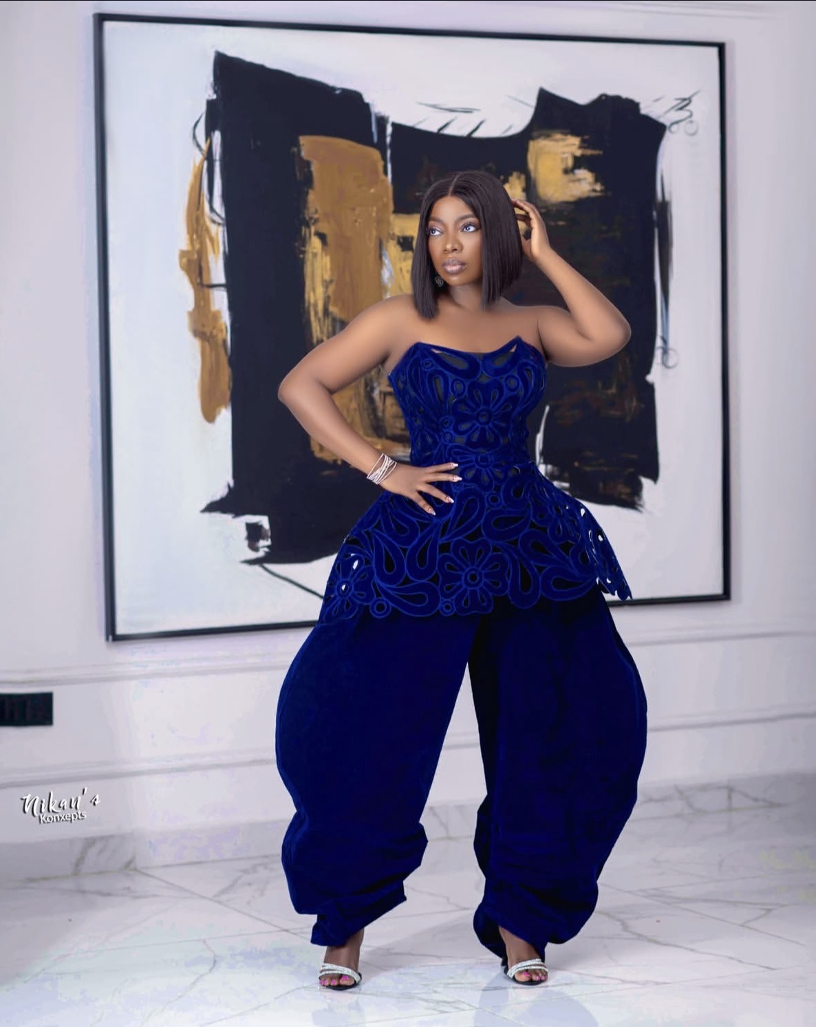 Layole Oyatogun stepped out in a cobalt blue Trish O. Couture ensemble outlined by sculptural experimentation. A laser-cut peplum bodice framed her waist with intricate floral motifs, whereas voluminous barrel velvet pants launched architectural drama.