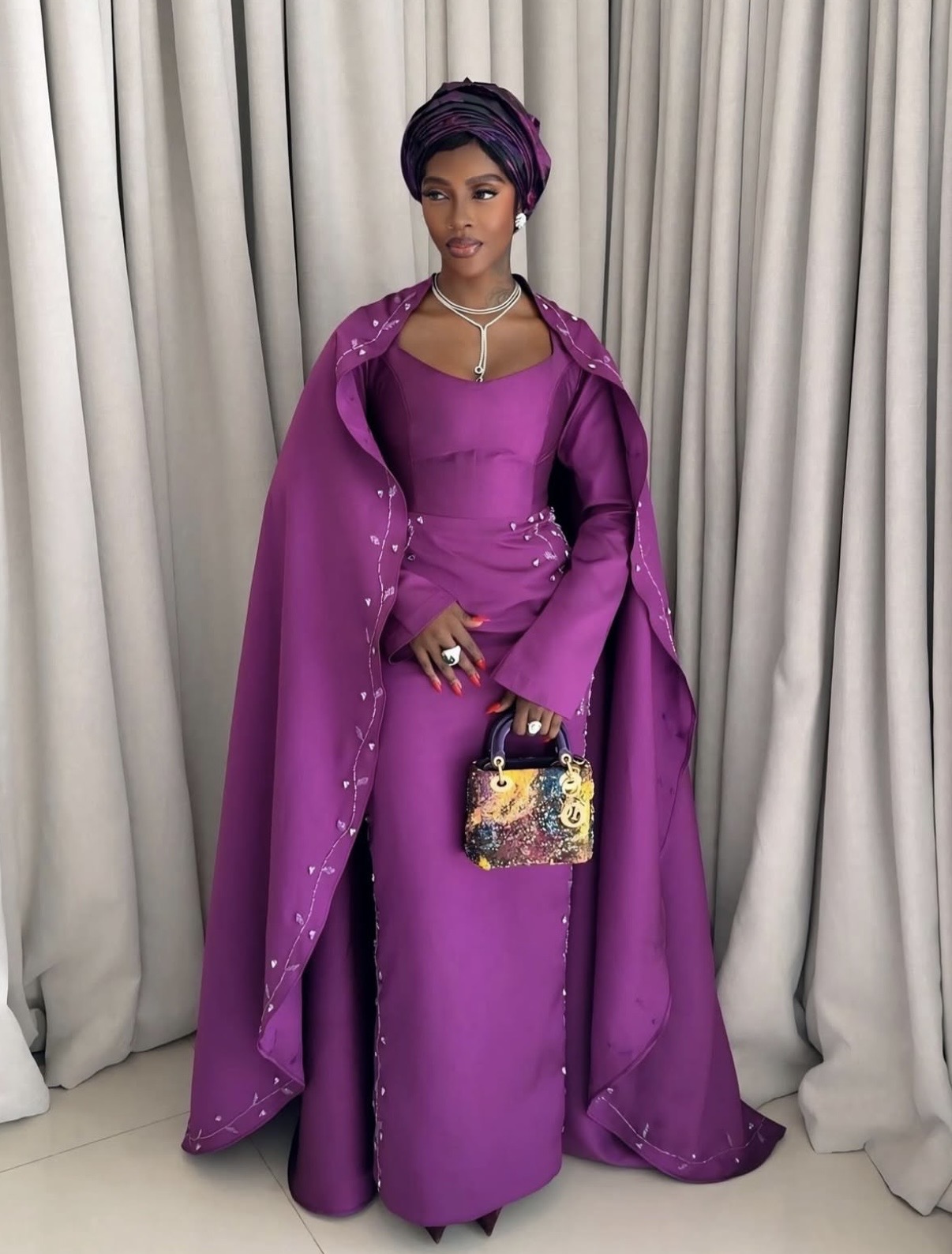 Nevertheless, it was the dramatic floor-length cape, embellished with delicate silver embroidery, that reworked the look right into a commanding visible narrative. A coordinating gele headwrap unified the monochromatic palette, whereas diamond jewellery and a colourful, embellished Woman Dior bag added dynamic distinction. Altogether, the ensemble captured festivity by craftsmanship and fearless shade.