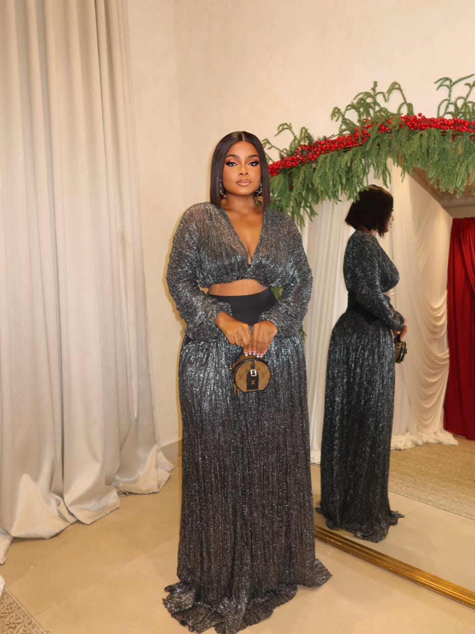 Bimbo Ademoye shimmered in a metallic Ciar Official costume that caught the sunshine with each motion. The cropped deep V-neck prime added a contact of daring, whereas the flowing skirt balanced the look with grace.