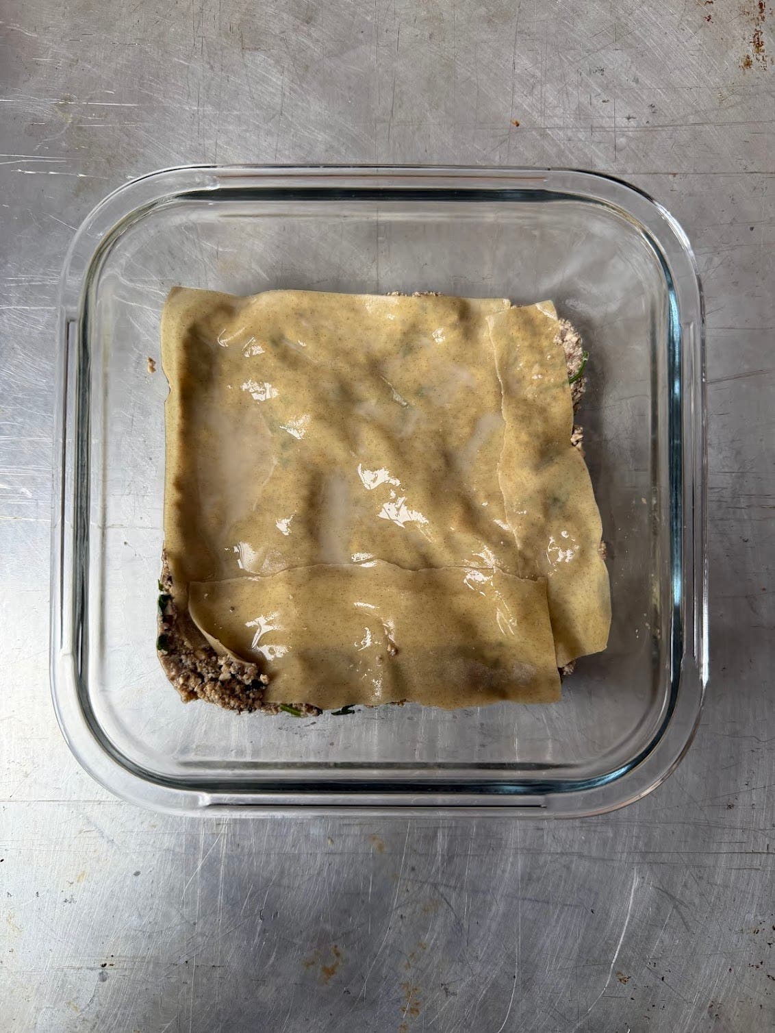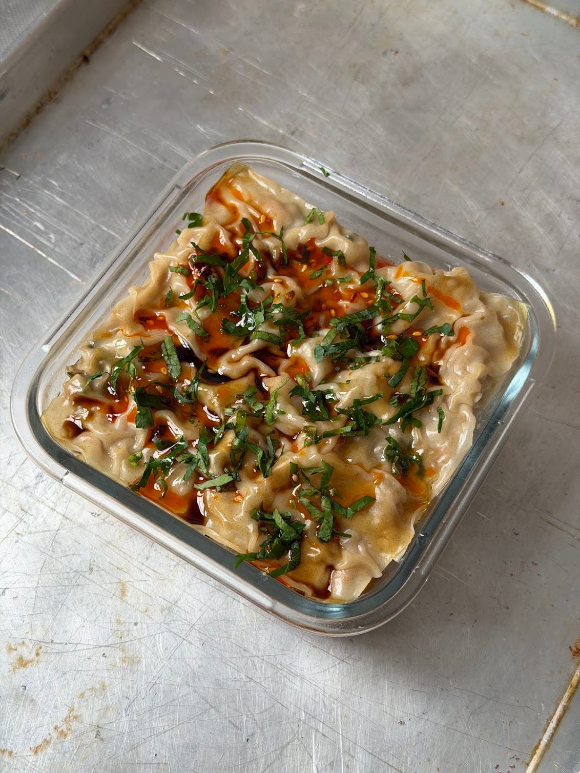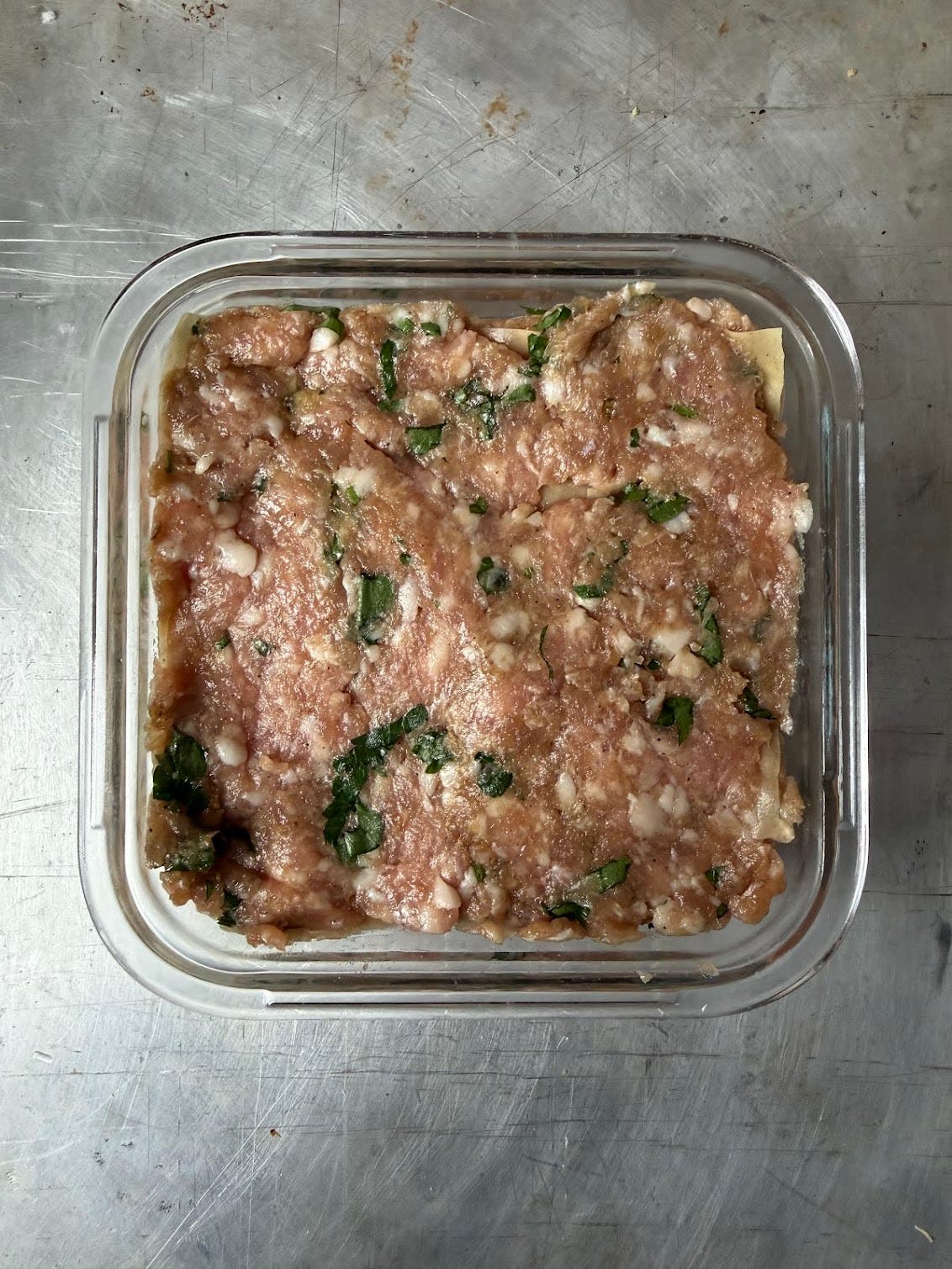 Mélanger la viande avec le gingembre et l’ail râpés, le persil émincé et les assaisonnements. Dans un petit plat à gratin, disposer une couche de feuilles pour raviolis, les brosser avec un peu d’eau. Ajouter une couche de la préparation à base de viande, puis une couche de feuilles pour raviolis, et ainsi de suite jusqu’au bord de votre plat. Finir avec une couche de feuilles pour raviolis puis faire cuire à la vapeur dans une cocotte ou un panier pendant une vingtaine de minutes. Servir très chaud en nappant de sauce soja et d’huile de sésame pimentée.