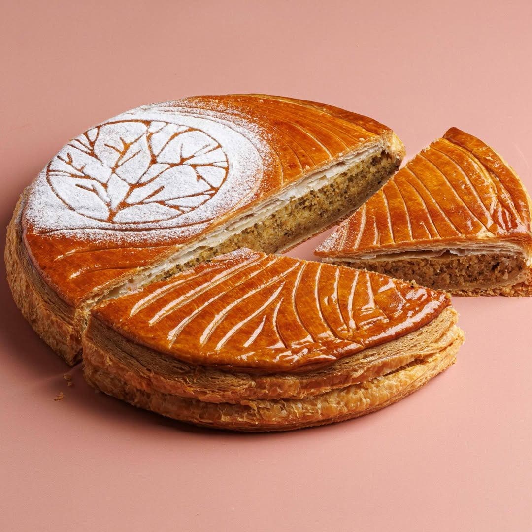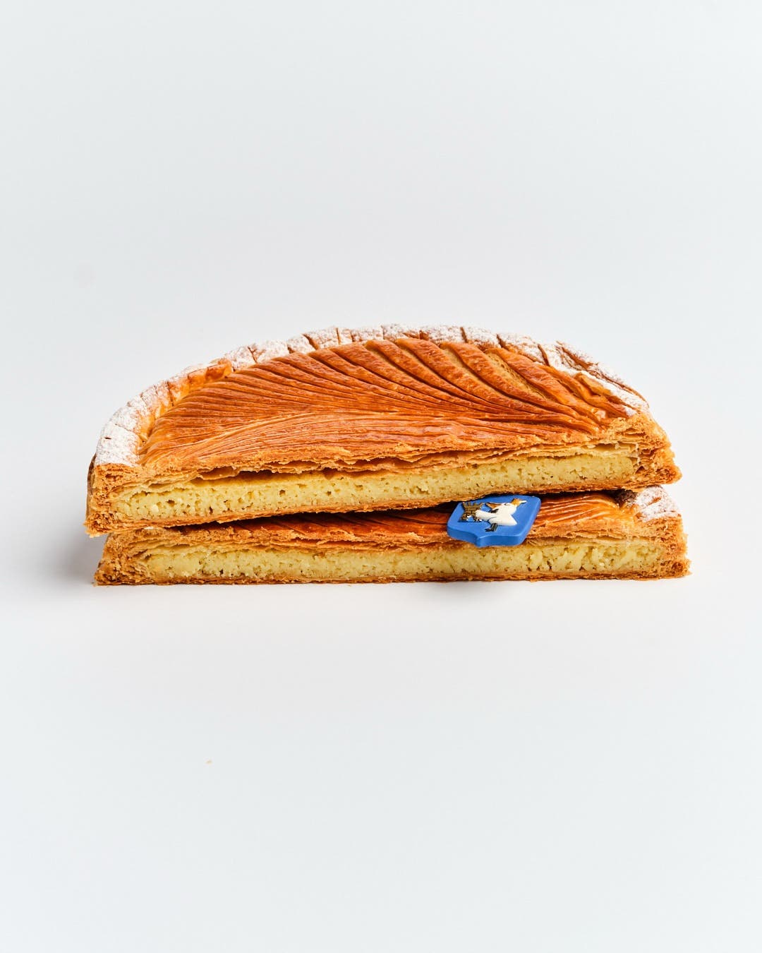 La galette frangipane de Jeffrey Cagnes, relevée au rhum, est celle qui nous a le plus rappelé nos souvenirs de galettes en famille, ultra-généreuse, bien tradi mais jamais boring. (de 6,50 à 43 euros)