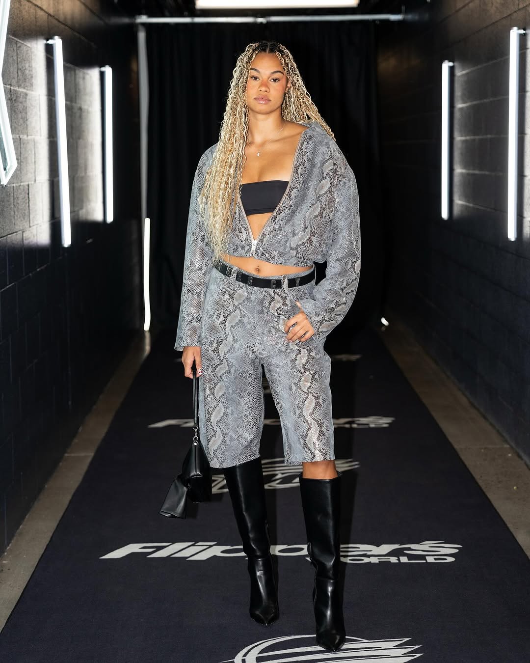 Snake print can simply really feel overwhelming, however this hoodie-and-shorts set retains issues relaxed. The straightforward match tones down the daring sample, making it wearable slightly than costume-like. A black belt cinched on the waist breaks up the print and provides form. From there, black boots step in to stabilize the look, guaranteeing every thing is cohesive.