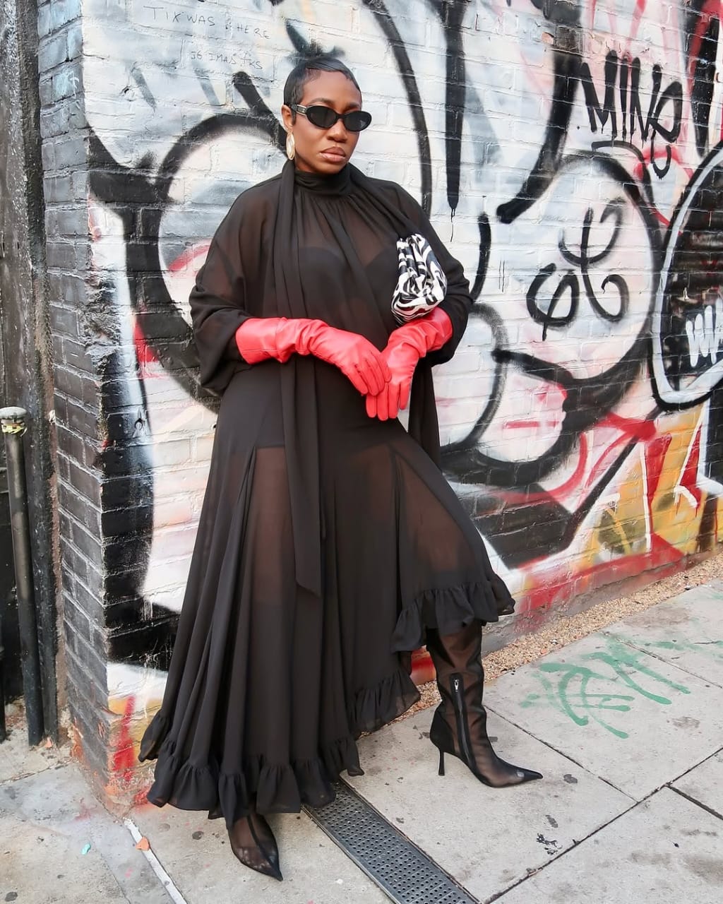 For days when the climate isn’t so chilly, sheer layers are value a attempt. This look proves that layering can nonetheless really feel intentional. A black bodysuit introduces construction and edge, setting the inspiration for the outfit. From there, a sheer gown in an identical hue provides an air of romance. Sheer black boots echo the temper of your entire look, whereas an animal-print purse and crimson gloves inject character into the providing. The consequence feels eclectic, private, and confidently unconventional.