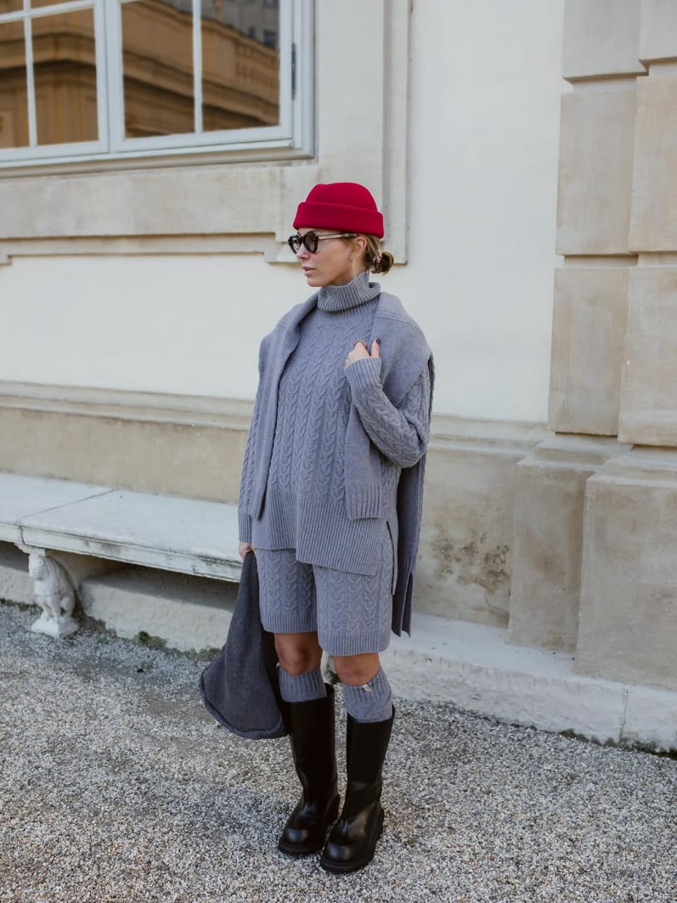 Layered knits in related tones create depth with out visible litter. The textures construct on each other, giving the outfit a comfortable but thought of really feel. Knit socks peeking out from black boots add each heat and an sudden element. A turtleneck and knit shorts kind a cohesive base, whereas an identical sweater draped over the shoulder provides ease. Lastly, a crimson textured hat introduces distinction, stopping the look from feeling too muted.