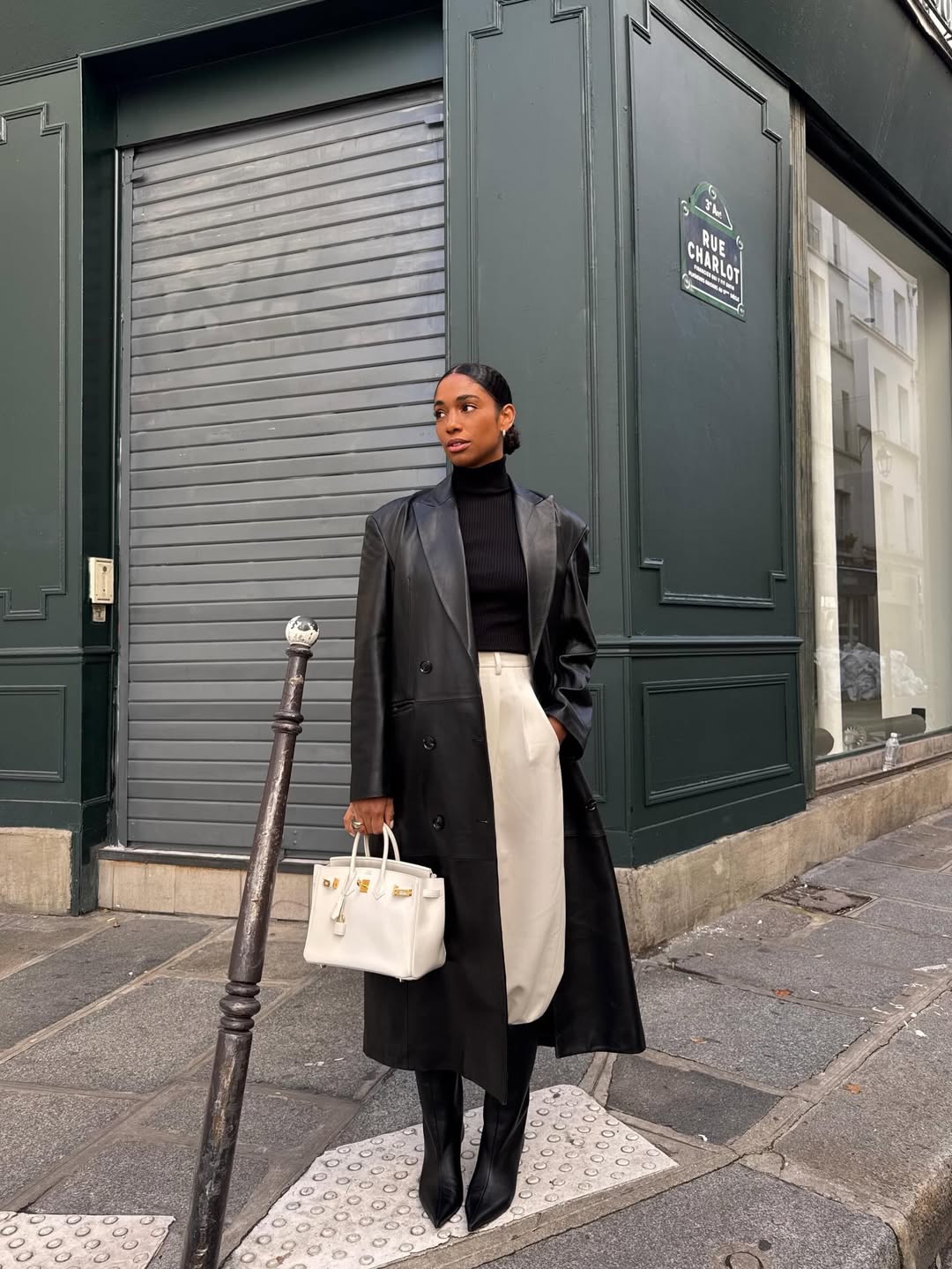 Right here, texture takes middle stage. A structured leather-based shirt defines the higher physique, whereas a leather-based flared skirt introduces motion and prevents the look from feeling too inflexible. To finish the story, black leather-based stiletto boots lengthen the fabric from high to toe. They sharpen the silhouette and elevate the stance, giving the outfit a refined, assured end.