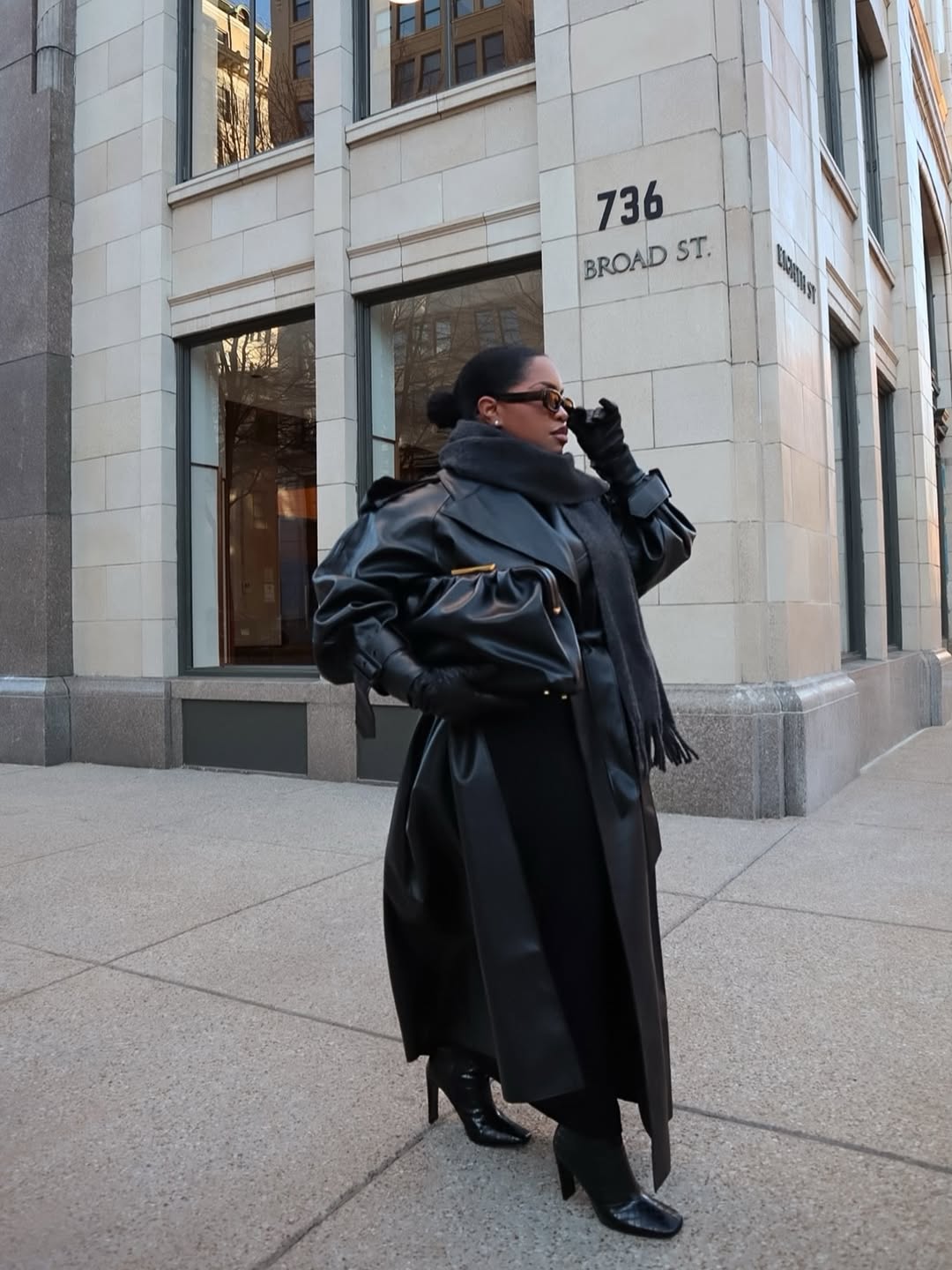 woman wearing black patent leather coat with matching pants and boots