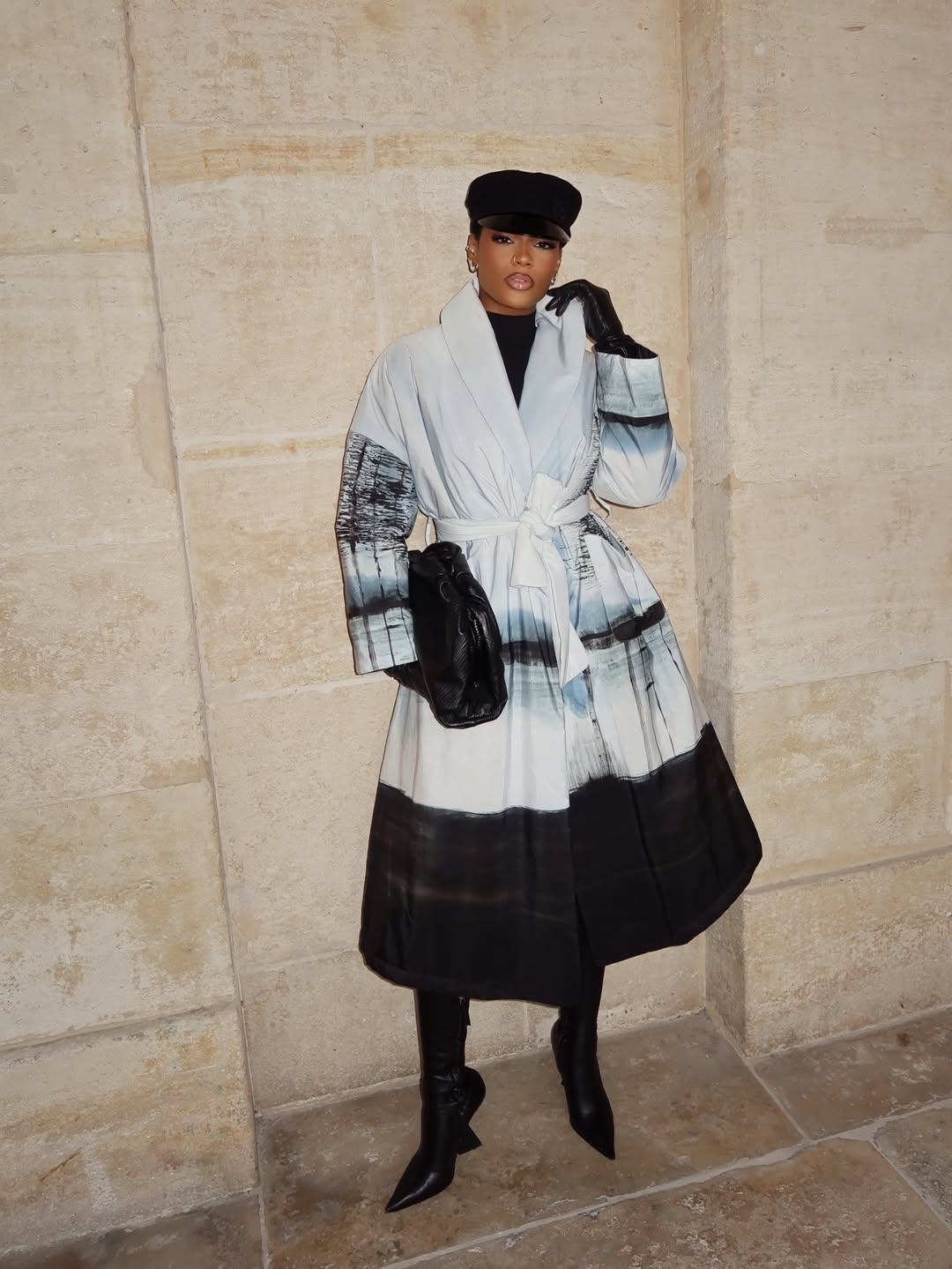 woman wearing printed long coat with black boots and hat