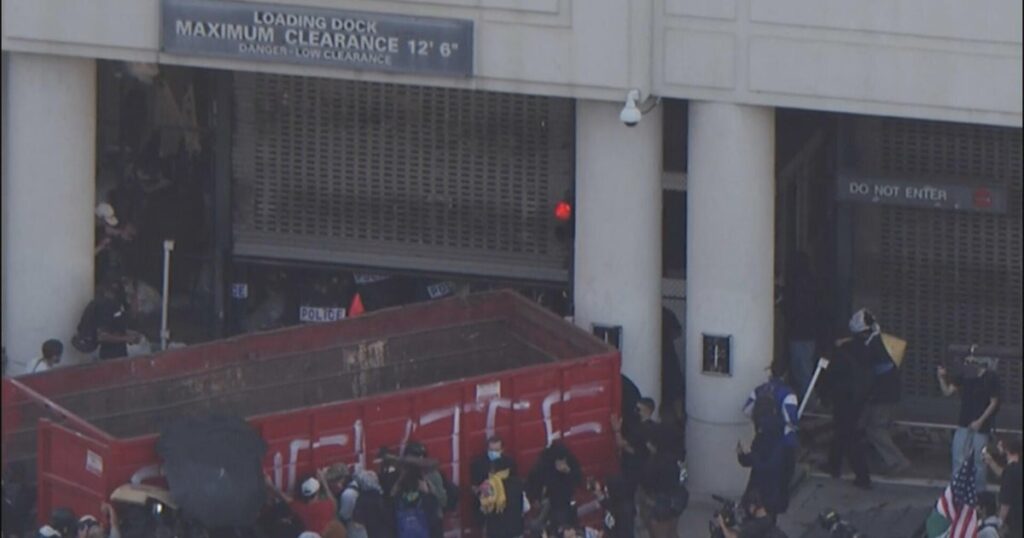 After marching for about an hour, a big group of protesters settled outdoors the Edward R. Roybal Federal Constructing in downtown LA. On the advanced’s loading dock, protesters threw gadgets at federal brokers, who had been wearing riot gear and guarding the doorway. A portion of the group pushed a big development dumpster in entrance of the loading dock’s entrance after federal brokers deployed pepper balls and tear fuel. Others vandalized components of the constructing.
