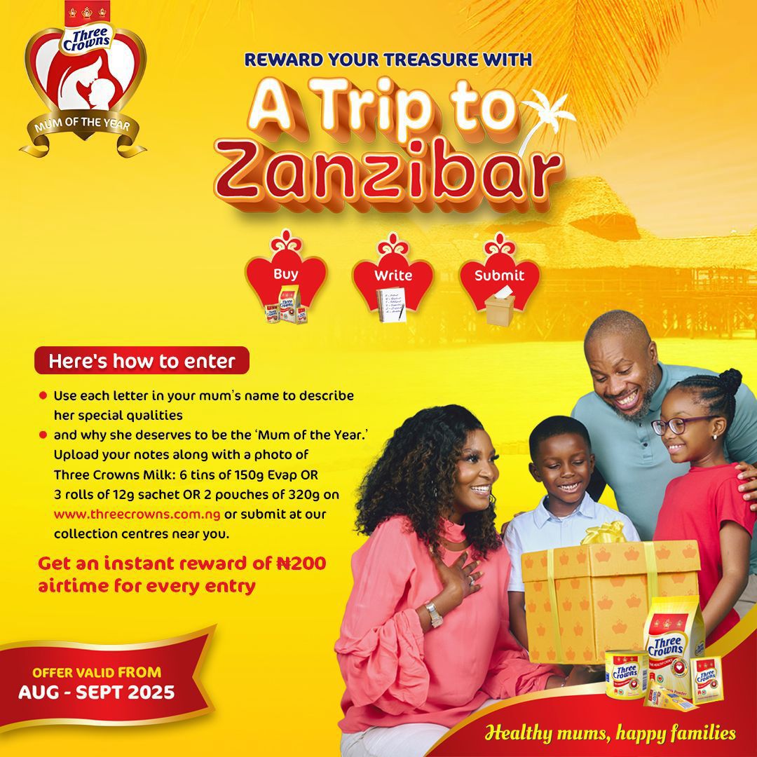 For extra details about the Three Crowns Mum of the 12 months 2025 competitors, go to www.threecrowns.com.ng. Entry deadline and extra terms and conditions apply.