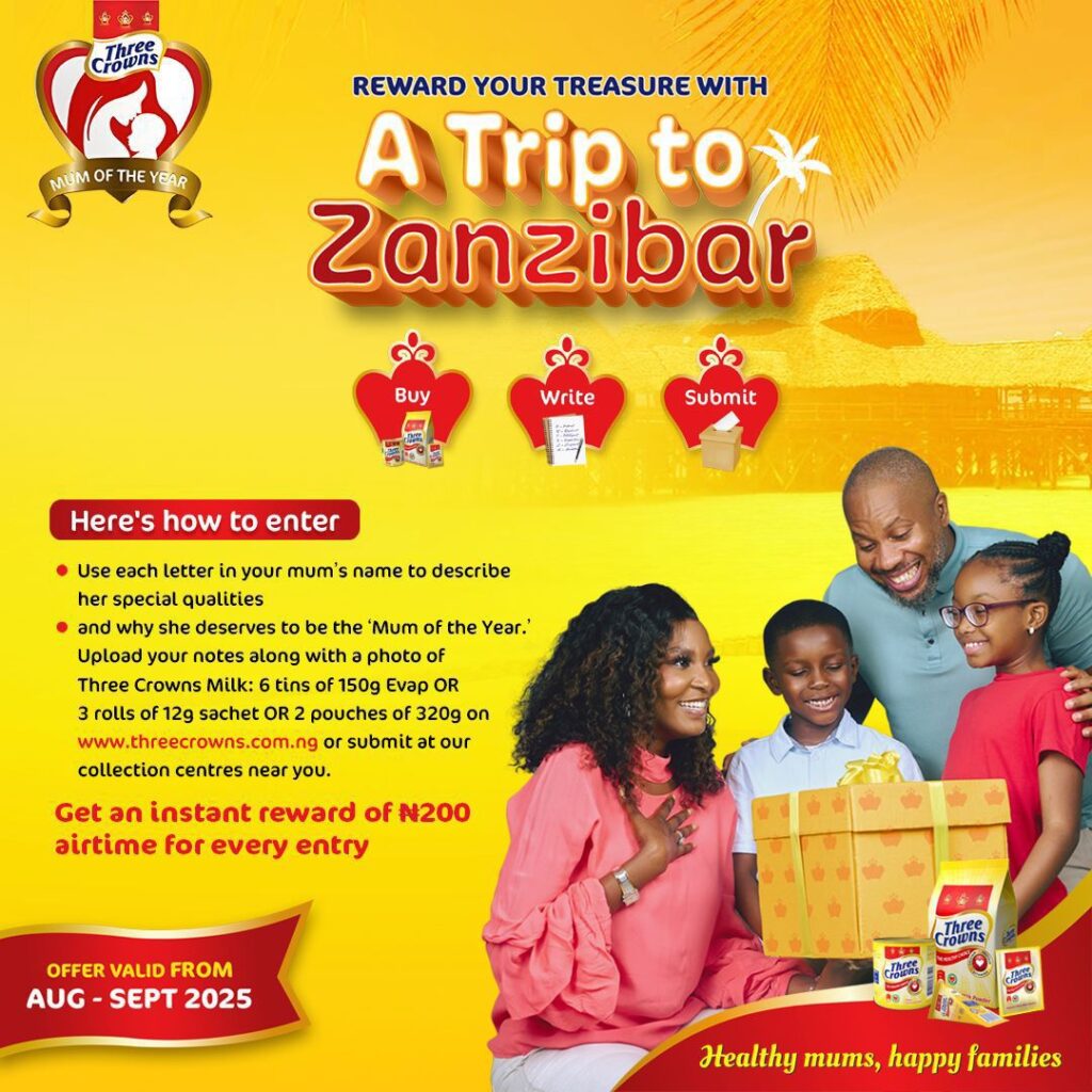 The competitors will acknowledge moms who embody the Three Crowns model values; being match, good, fun-loving, and most significantly, full of affection for his or her households. The three winners of Three Crowns Mom of the Year competition will every obtain an all-expense paid journey for themselves and two members of their households to Zanzibar plus one yr provide of Three Crowns Milk, whereas others would win comfort prizes, together with kitchen home equipment and a variety of Three Crowns Milk merchandise.